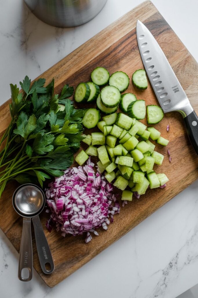 Chop your cucumber, finely dice the onion, and chop the parsley. I try to keep everything around the same size so every bite tastes balanced.