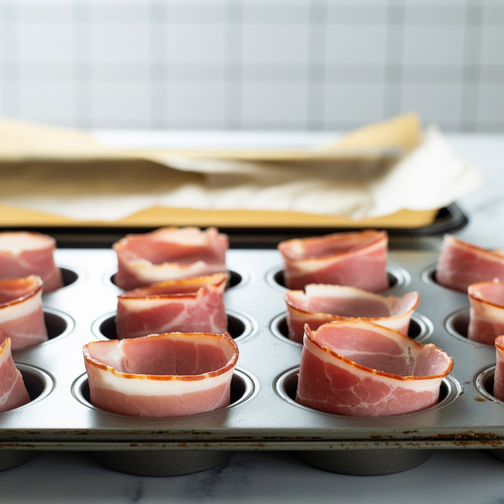 Place one slice of ham into each muffin cavity, pressing it to form a cup. Overlapping edges are fine—they make a sturdier base. - Mix the Eggs