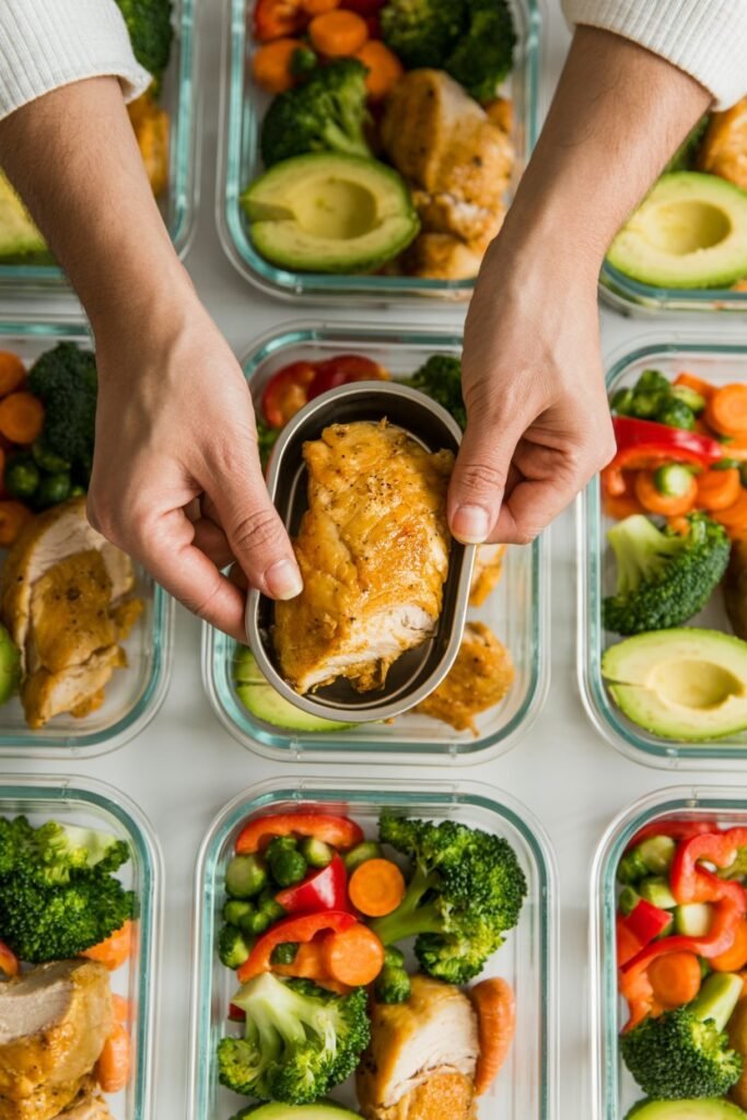 Use containers, portion out fats and proteins, and rotate ingredients for variety.