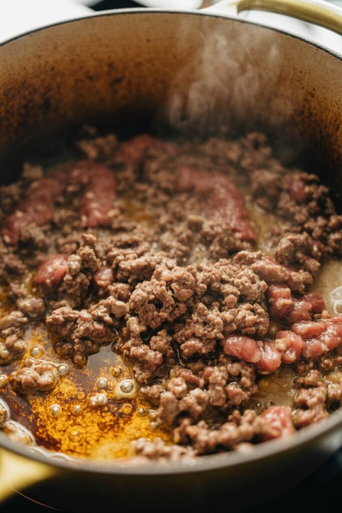 Pro tip: Browning the meat slowly builds depth of flavor — don’t rush it. - Add Aromatics