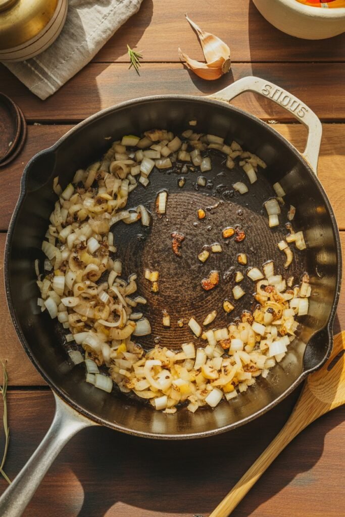 Next, I toss in the diced onion and garlic. The aroma that fills the kitchen here is unbeatable — it’s like the first hint that dinner is about to be amazing.