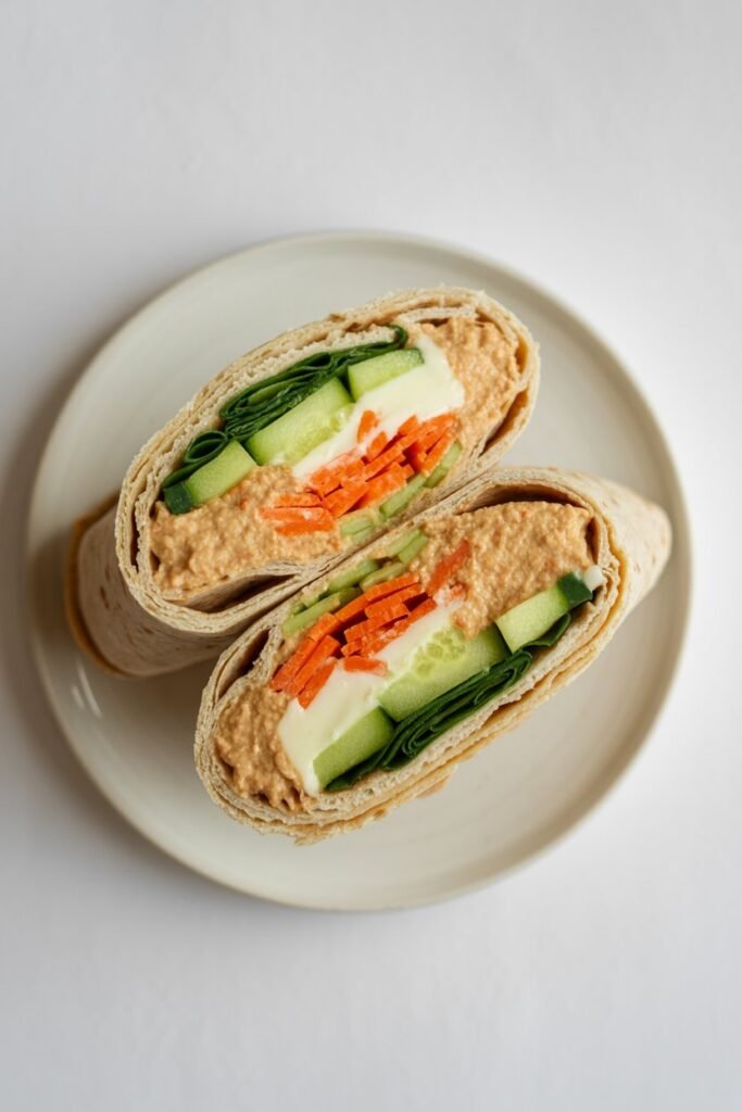 This wrap is my favorite way to sneak vegetables into a lunch my kids actually eat. Hummus makes it creamy, and the tortilla keeps it easy to handle.
