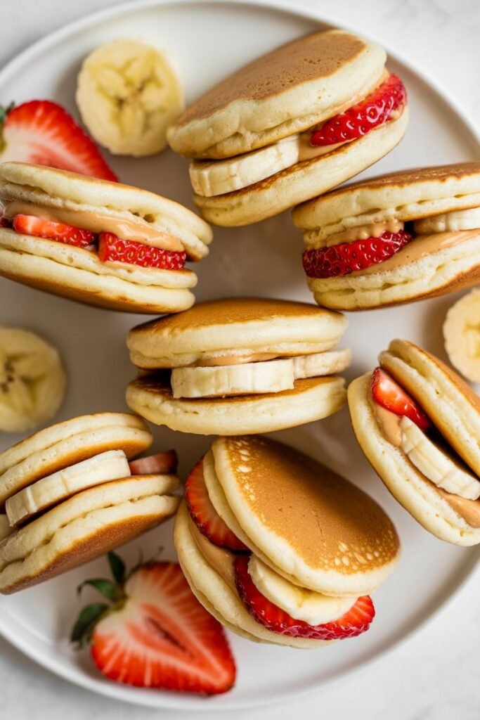 Leftover pancakes are a lunchbox lifesaver. Mini pancake sandwiches with peanut butter and fruit are sweet, filling, and easy to make.