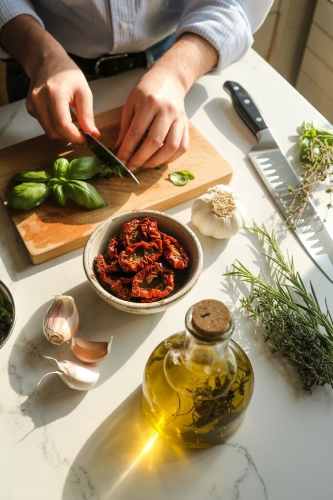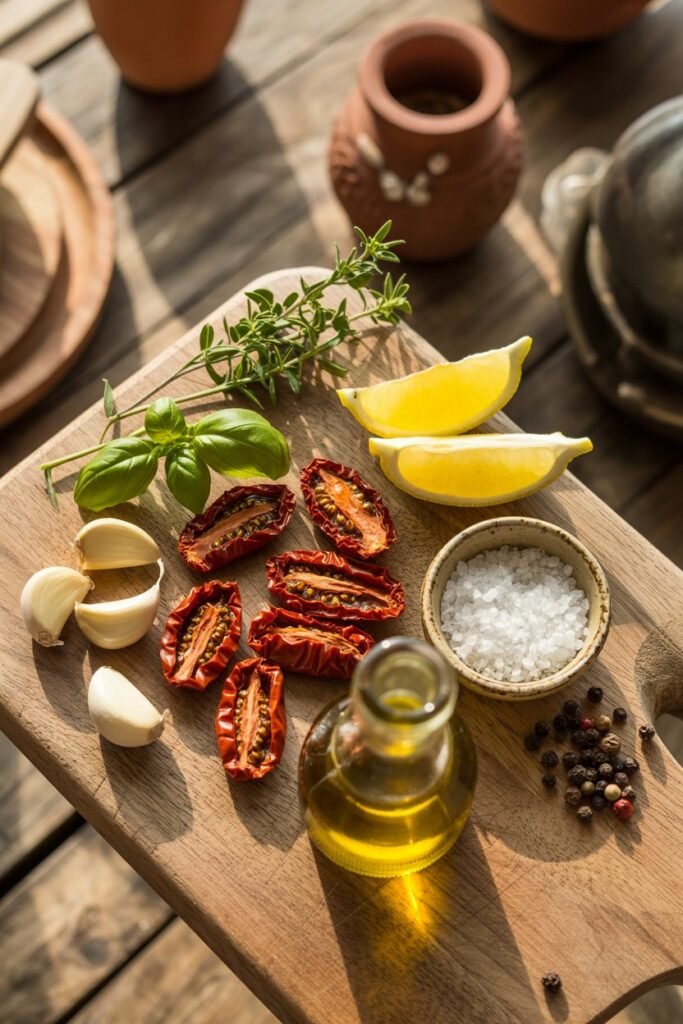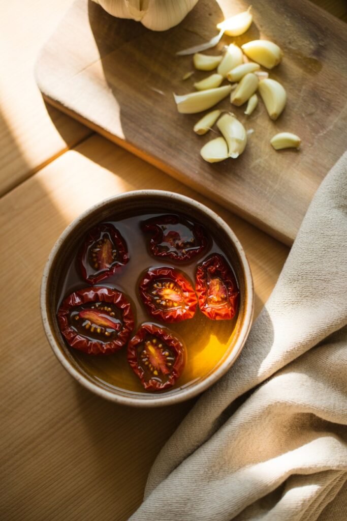 • Prepare the sun-dried tomatoes and garlic – Soak tomatoes in warm water for 10–15 minutes if dry. Roughly chop and lightly smash garlic cloves.