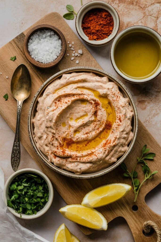 A creamy, tangy, and garlicky dip that’s quick to make and perfect for spreading on bread, dipping veggies, or adding to Mediterranean-inspired dishes.