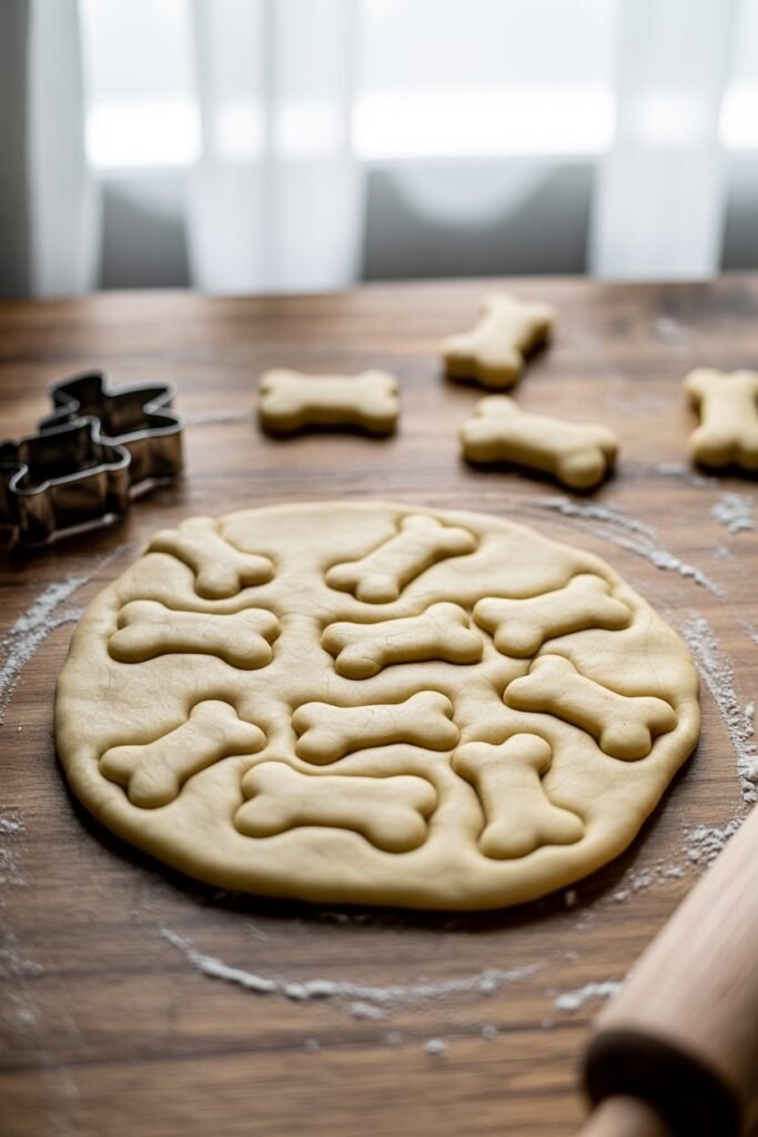 Once rolled, grab your bone-shaped cookie cutters (or any fun shapes you prefer—stars, hearts, paws all work great!) and cut out as many biscuits as possible.