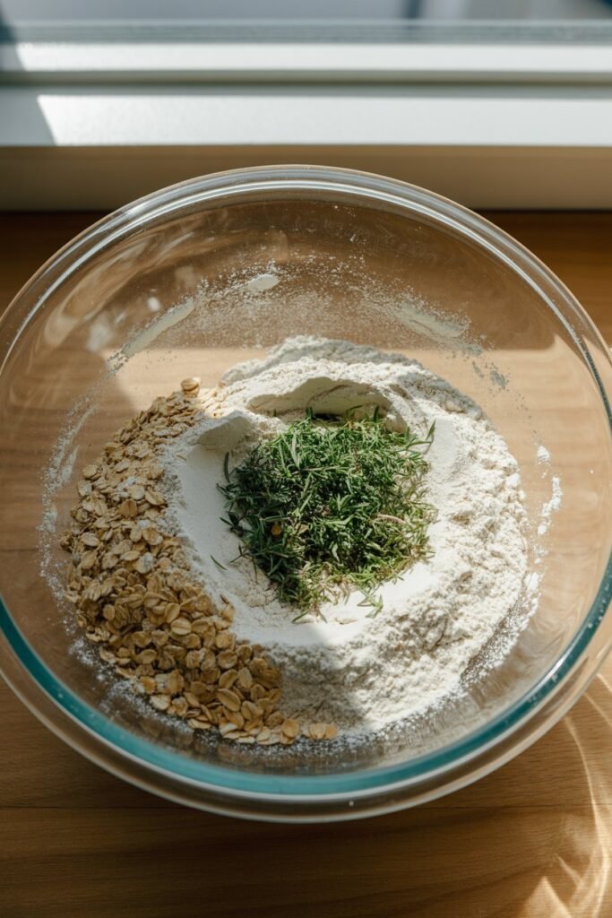In a large bowl, whisk together whole wheat flour and rolled oats. - Add Fresh Herbs