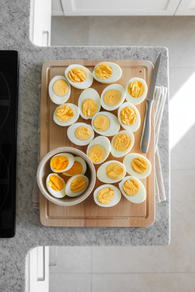 Once your eggs are cool (don’t rush this part — warm eggs are a peeling nightmare), gently peel them and slice them in half lengthwise.