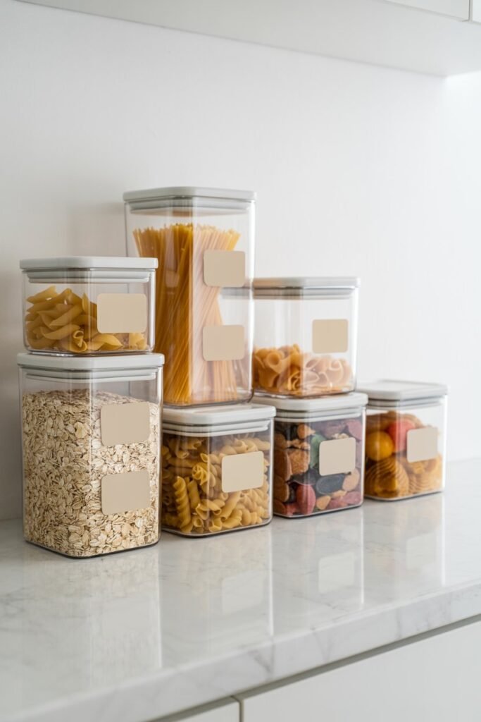 These are the secret to a clutter-free pantry. With beige or white lids and clear containers, you can easily see what’s inside while keeping everything airtight and organized.