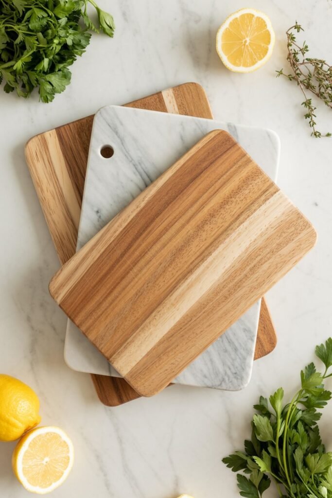 Not only practical but also photogenic — neutral cutting boards double as serving platters and decorative accents. Mix marble with light acacia for a layered look.