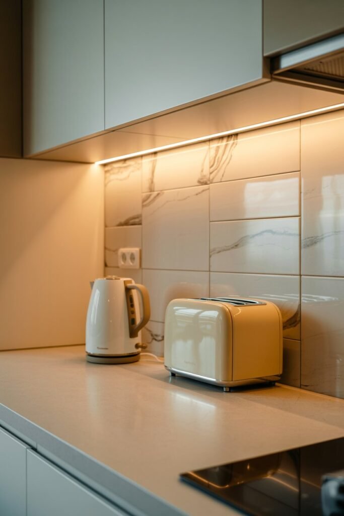 Lighting makes or breaks your kitchen aesthetic. Soft white LEDs under cabinets give your space that calm, inviting glow without harsh brightness.