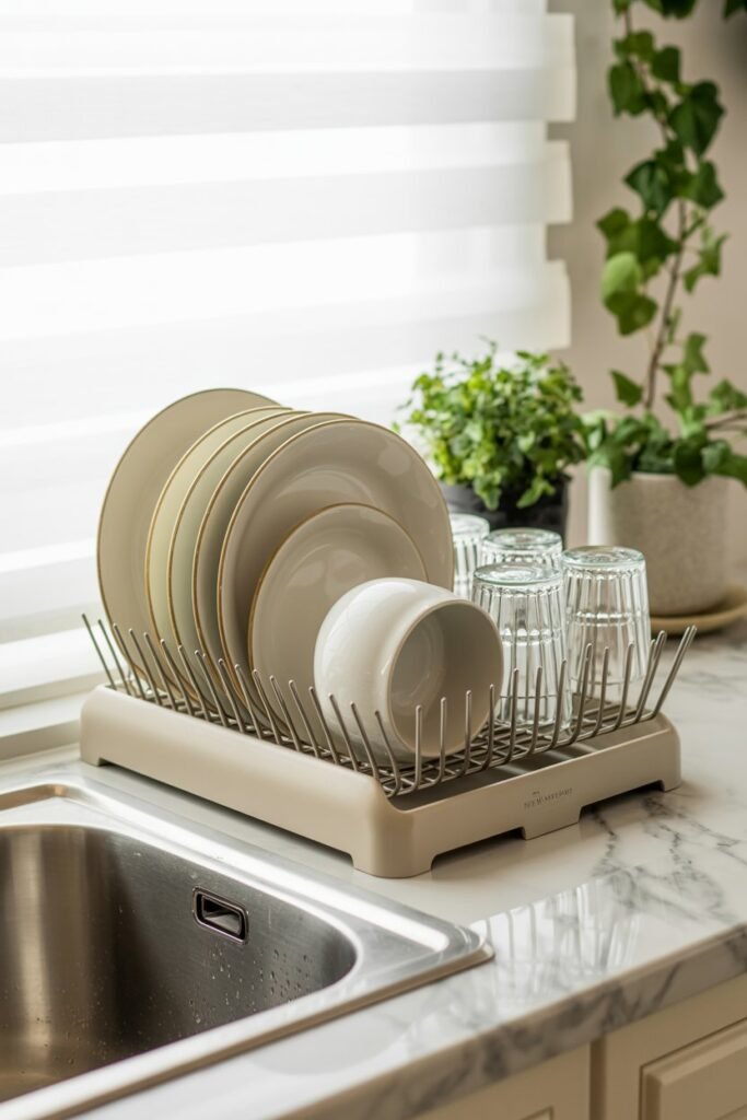 Even practical items can look beautiful. A neutral dish rack with bamboo accents or a matte finish turns a functional item into a stylish moment on your counter.