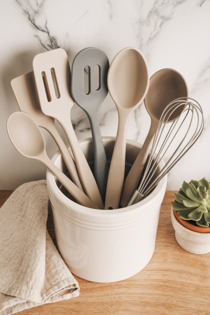 Upgrade your mismatched spoons and spatulas for a full matching silicone set in warm beige, gray, or stone tones. They’re heat-resistant, easy to clean, and gentle on nonstick pans.