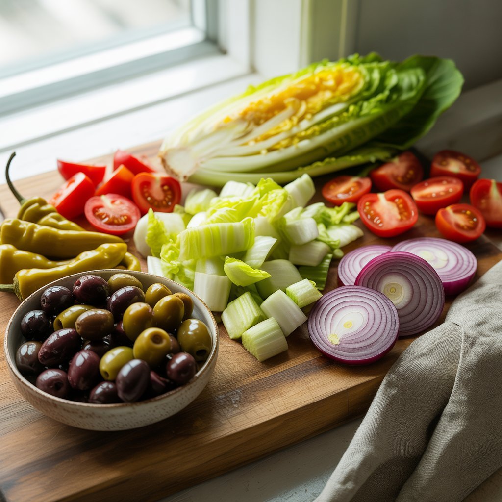 • Wash and chop the lettuce into bite-sized pieces. Halve the cherry tomatoes, thinly slice the red onion, and drain the black olives. Leave the pepperoncini whole or slice them based on your preference.