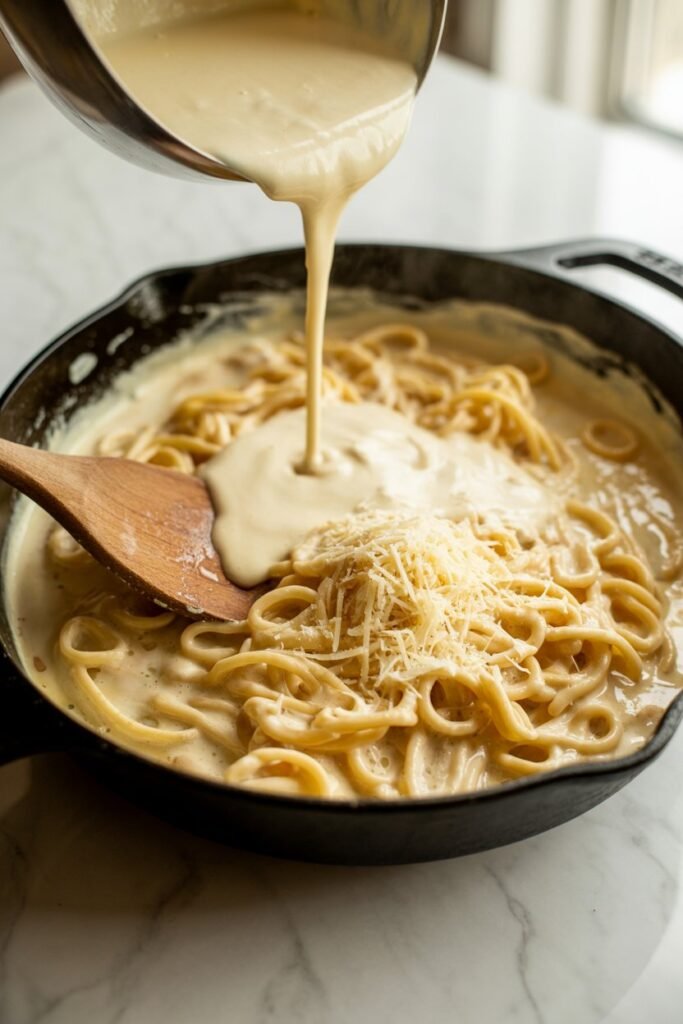 Once the pasta is cooked and coated in a glossy sauce, reduce the heat to low. Pour in the cream and sprinkle in the Parmesan cheese. Stir well until everything blends into a smooth, velvety sauce.