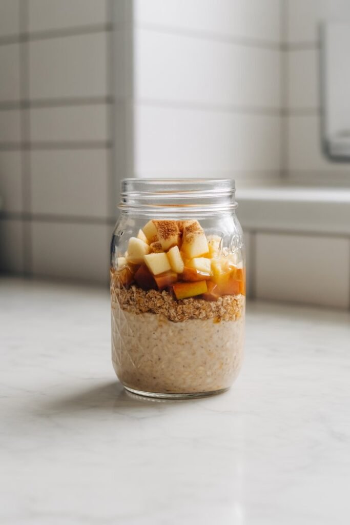 Cover the jar or bowl tightly and refrigerate it overnight. During the soaking time, the oats absorb the liquid and flavors, turning creamy and soft while the apple stays slightly textured.