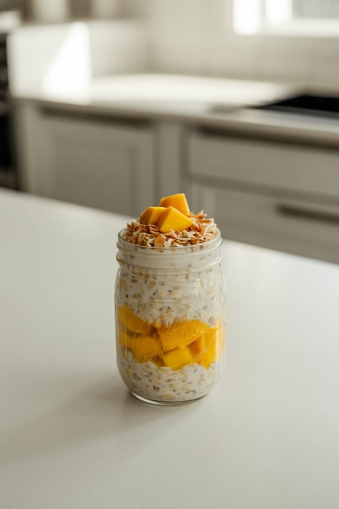 Cover and place the jar or bowl in the fridge overnight. While you sleep, the oats soften, chia seeds thicken the mixture, and the mango flavor infuses the creamy base.