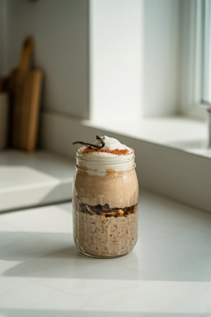 Cover the jar or bowl tightly and refrigerate overnight. During this time, the oats soften and absorb the coffee flavor, while the chia seeds thicken the mixture to a creamy consistency.