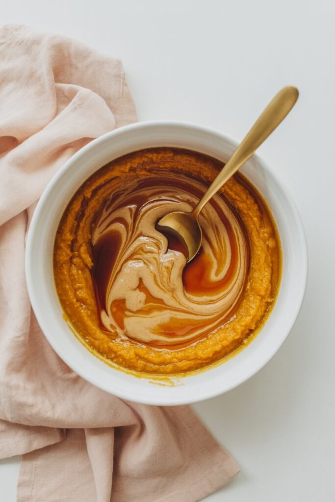 - In a mixing bowl, stir together the pumpkin puree, almond butter, and maple syrup until smooth.