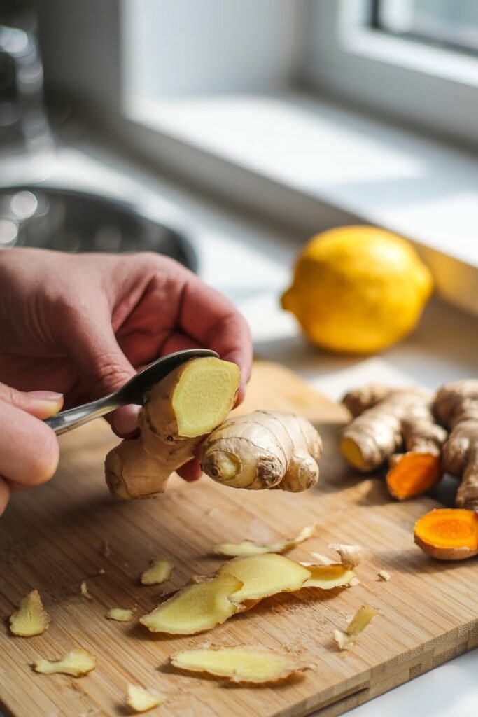 Start with fresh ginger, lemon, turmeric, and a little honey. Peel the ginger using the edge of a spoon to remove just the skin without wasting any root.