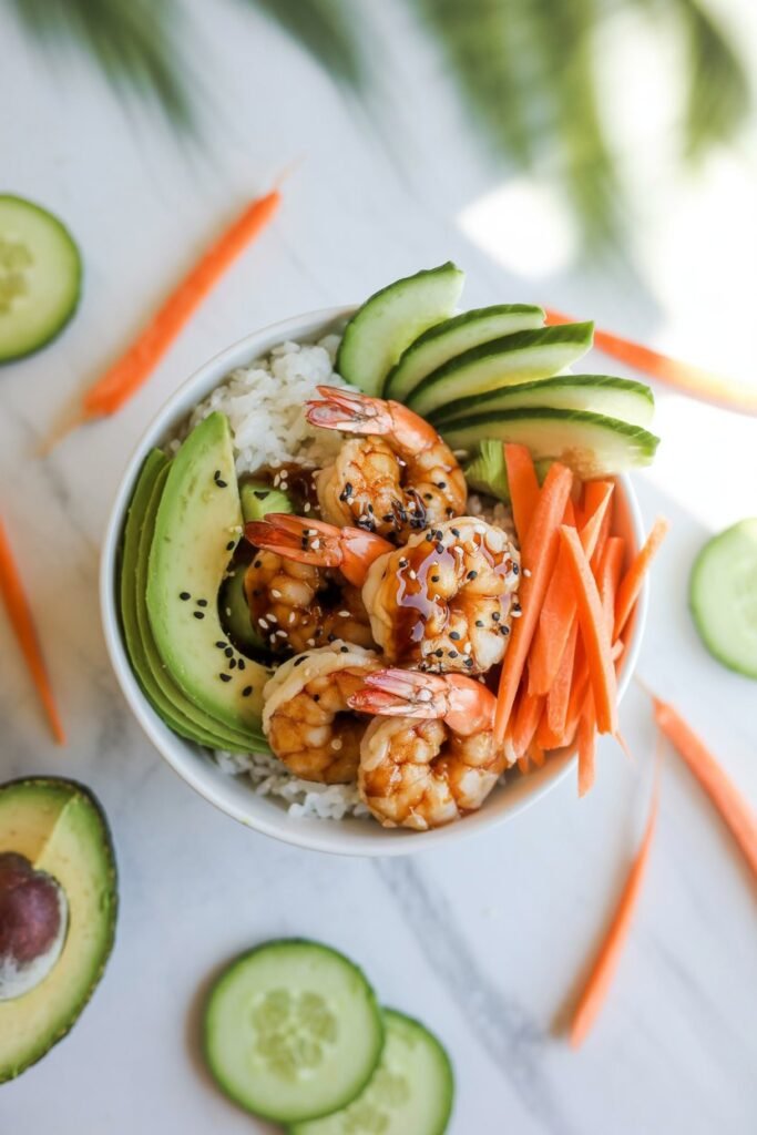 This teriyaki shrimp sushi bowl is one of those meals that feels special without any fuss. The shrimp are juicy and perfectly glazed, the rice is light yet satisfying, and the fresh veggies add a crisp, refreshing bite.