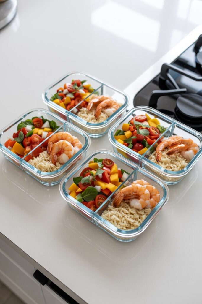 I keep the rice, shrimp, and toppings separate when possible so nothing gets soggy. It stays fresh for up to two days.