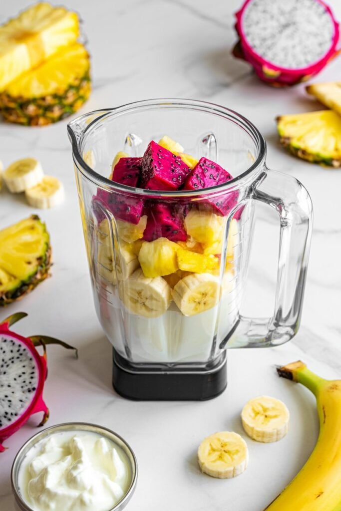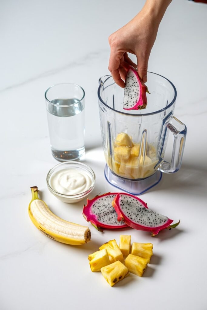 Top with the frozen dragon fruit and pineapple or mango chunks. Layering the ingredients this way helps the blender work efficiently and ensures a smooth, lump-free texture.
