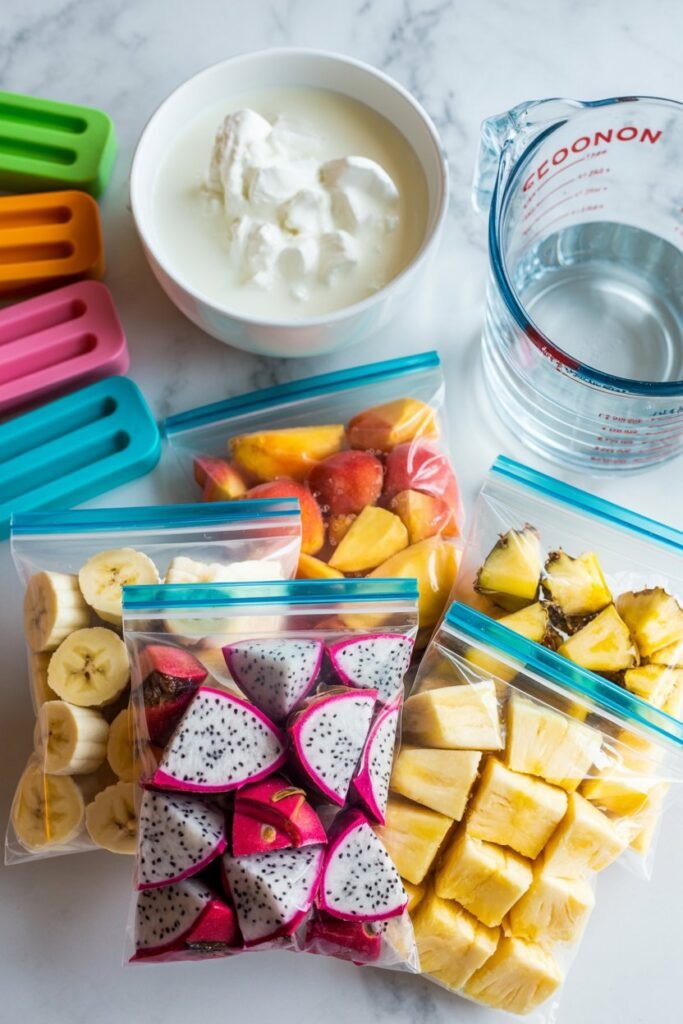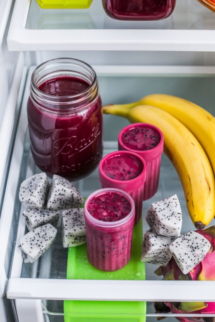 I like to prep smoothie packs for the week. I portion banana slices, dragon fruit, and pineapple or mango into small freezer bags.