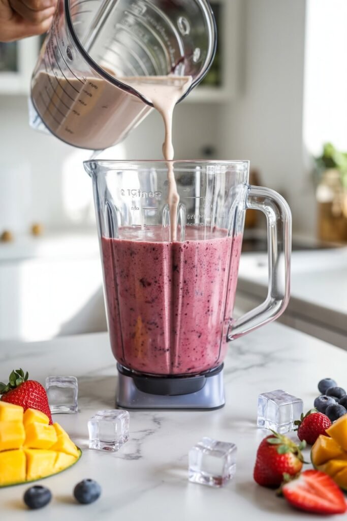 Start with liquid first, then soft fruit like banana and yogurt, and finally frozen fruit on top. This helps the blender work efficiently and prevents chunks from getting stuck.